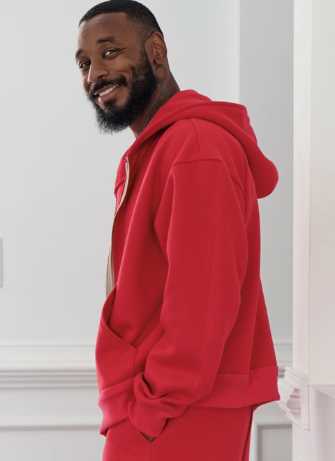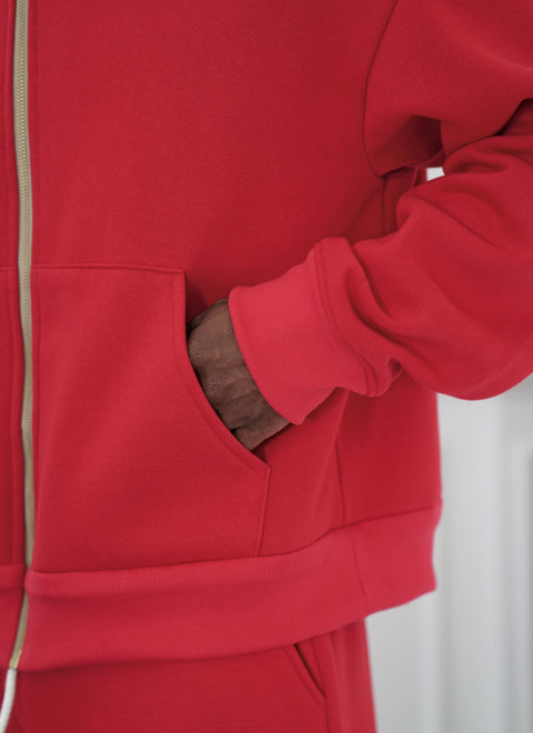 Lielizmēra kapucim ar rāvējslēdzēju ir nolaisti pleci, priekšējās kabatas un ribu trikotāžas apdare pie aproces un apakšmalas joslas. Uzvelkamas sporta bikses ar elastīgu jostasvietu, priekšējām sarkanām kaklasaitēm un kabatām.