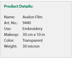 Avalon plēvi var viegli iestiept rāmī dekoratīvai šūšanai uz dvieļiem, trikotāžas vai džempera auduma, lai nepieļautu, ka šuves nogrimst un pazūd auduma struktūrā.