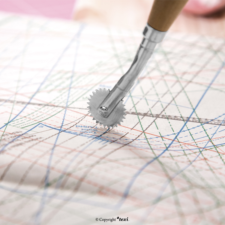 Metāla rullītis ar koka rokturi paredzēts piegrieztņu kopēšanai, kā arī auduma marķēšanai un dekoratīviem locījuma caurumiem.