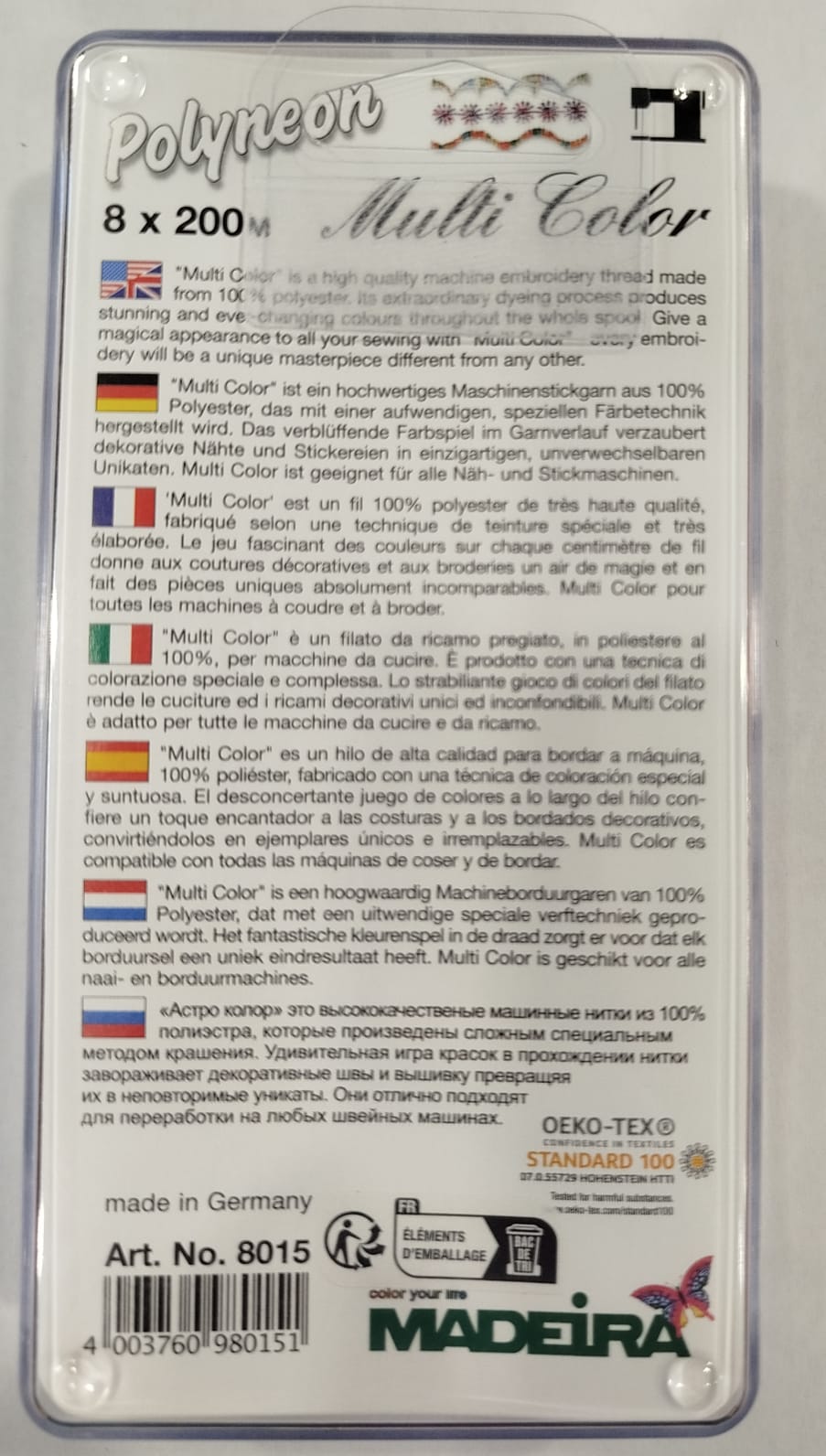 Polyneon Multicolor komplekts 8x200m. Universāls poliestera mašīnas izšūšanas diegs visiem dizainiem. Ieteicams bieži mazgātiem tekstilizstrādājumiem, piemēram, sporta, āra un darba apģērbam. Augsta stiepes izturība, izturīga pret hloru. Piemērots visām šujmašīnām un izšūšanas mašīnām.
